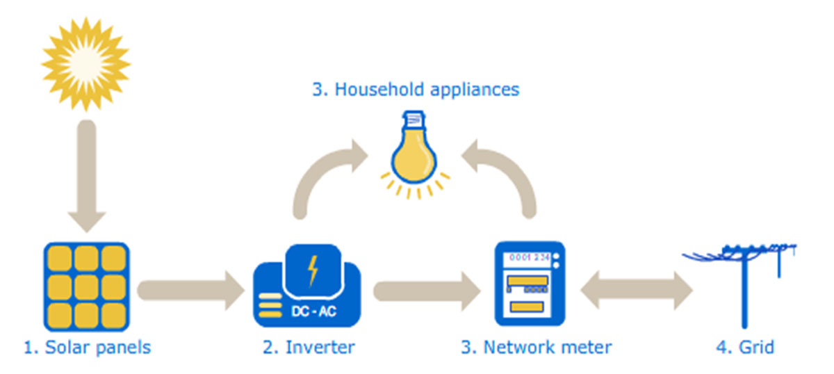 The light from the sun, made up of packets of energy called photons, shines onto a solar panel and creates an electric current through a process called the photovoltaic effect. Each panel produces a relatively small amount of energy but can be linked together with other panels to produce higher amounts of energy as a solar array. The electricity produced from a solar panel (or array) is in the form of direct current (DC). Although many electronic devices use DC electricity, including your phone or laptop, they are designed to operate using the electrical utility grid that provides (and requires) alternating current (AC). Therefore, for the solar electricity to be useful, it must first be converted from DC to AC using an inverter. This AC electricity from the inverter can then be used to power electronics locally or be sent to the electrical grid for use elsewhere.
